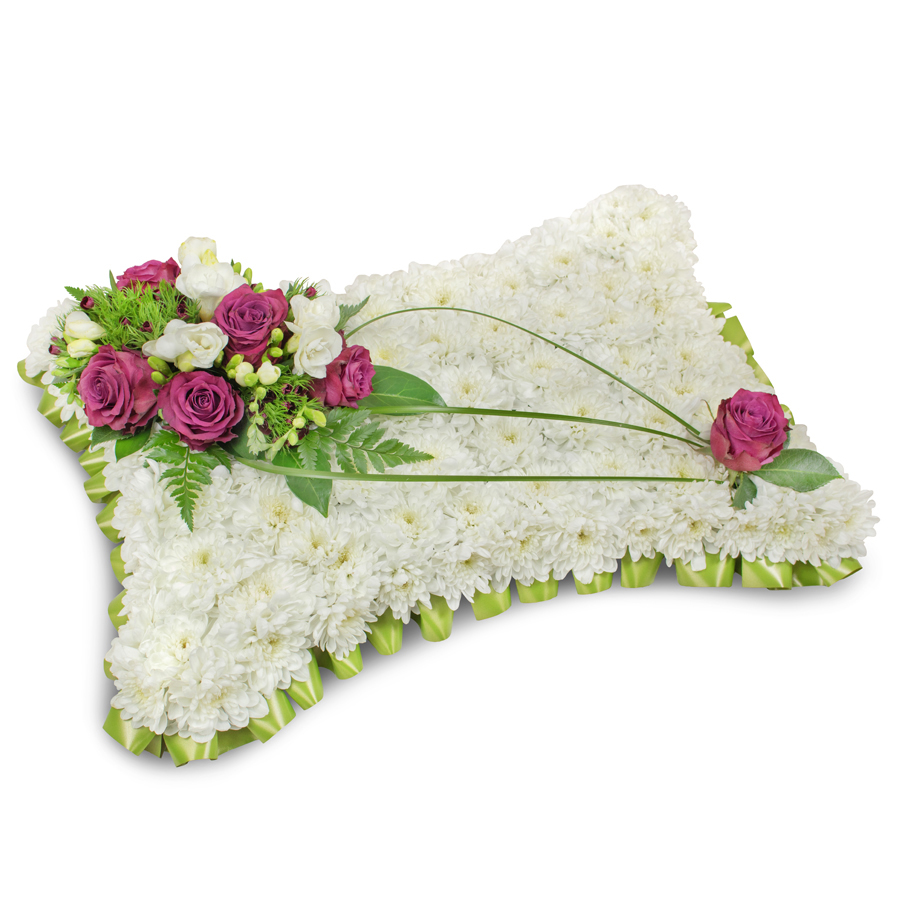 Honor your loved ones with our graceful pillow-shaped bouquet, designed to convey heartfelt love and peace. This beautiful arrangement includes white chrysanthemums, purple roses, white freesias, dianthus, and bear grass, each hand-picked for impeccable freshness and quality.