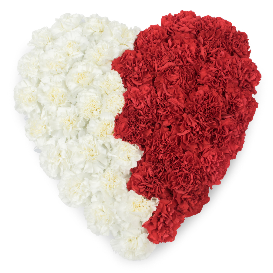 Express your sentiments with our lovely heart-shaped bouquet, featuring a delightful mix of white and red carnations, perfect for conveying love and sympathy.